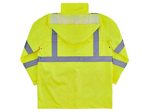 The Ergodyne GloWear 8366 lightweight high-visibility rain jacket is designed with waterproof materials (150D polyester oxford with a polyurethane (PU) coating) and fully taped seams for reliable protection in the face of stormy weather. This lightweight reflective rain jacket easily fits over workwear without sacrificing mobility. Fully taped seams are bonded to the jacket to keep water from sneaking in, while a vented cape back allows heat and moisture to escape for added breathability. An attached drawstring hood can be stowed away when not needed. Reflective tape on chest and arms adds visibility at night or in low-light conditions. It's the great lightweight, waterproof work jacket for those working in road construction, utilities, construction, emergency response, airline, railway, or survey crews.