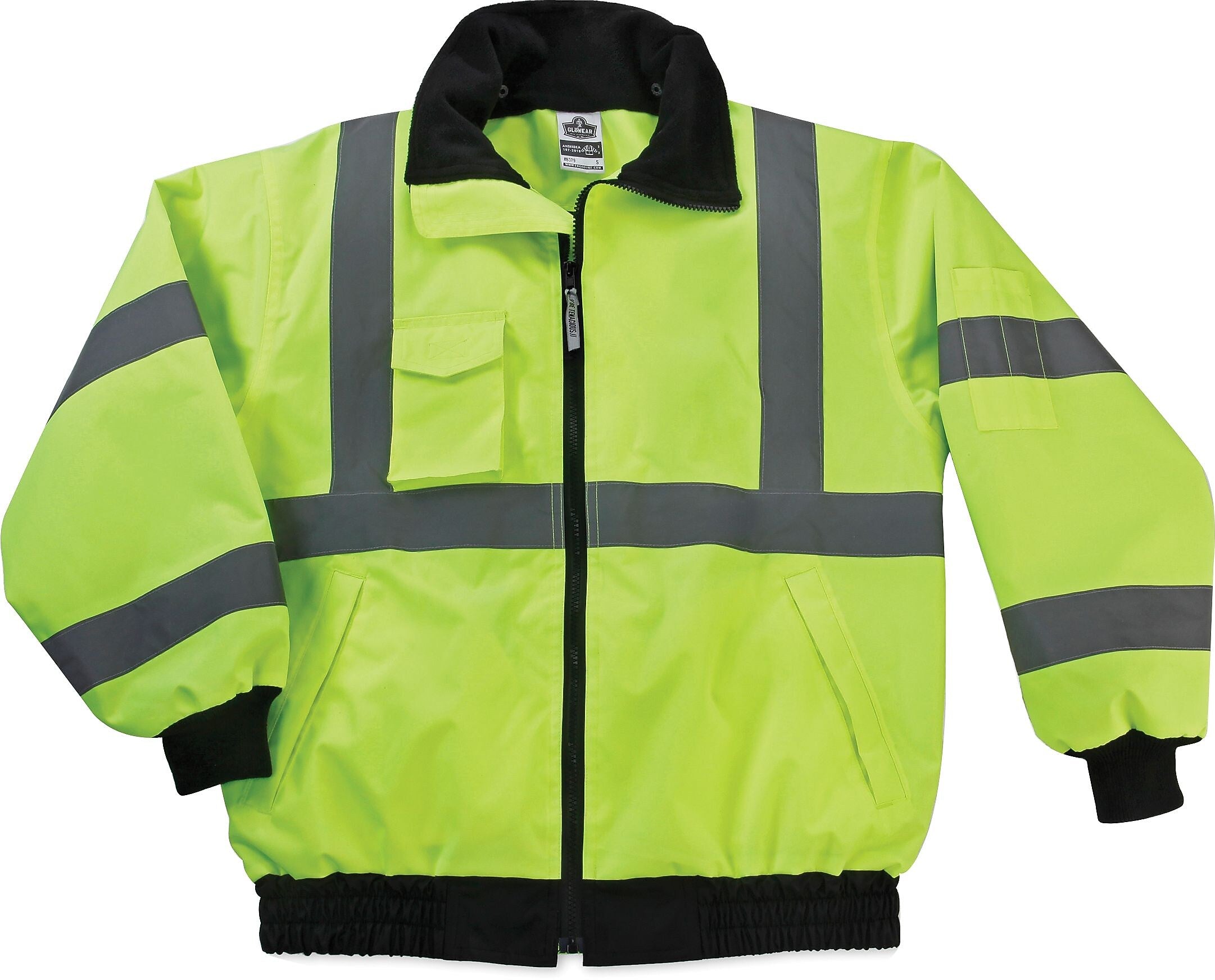 Ergodyne® GloWear® 8379 XL lime class 3 economy bomber jacket includes a weatherproof 100% polyester outer shell with 2" reflective material. Jacket having an inset hood with drawstring and stoppers is used by utility crewmembers.