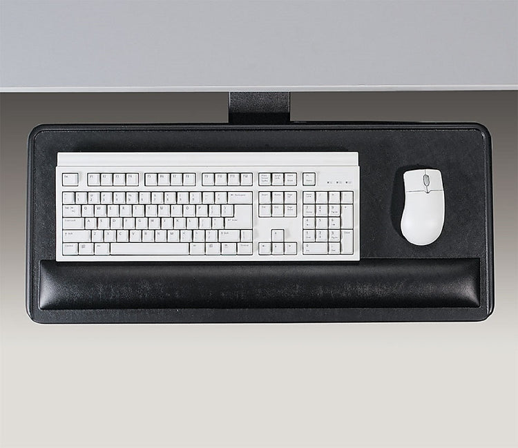 The LifeFlo Ergonomics 910-SPL Keyboard Platform is an ergonomic keyboard tray made of MDF, and a non-skid vinyl coating. The platform is 27" x 12" x .75". The bolt on palm rest is .875" high. The Standard Mechanism is fully articulating and swivels 360°. Height adjusts 5 3/4", is 17" deep, and tilts 15°.