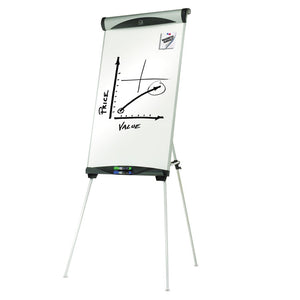 Collapsible easel with smooth magnetic whiteboard is designed for streamlined presentations. Delivers effective performance when collaboration is needed in occasional-use work environments. Steel-backed magnetic surface doubles as a bulletin board. Adjustable hooks and clamp hold standard-sized flipcharts for easy sheet tear-away. Extendable and retractable arms displays three sheets of paper simultaneously. Extend surface life with regular cleanings, using Quartet® cleaning solutions. Sturdy tripod base and telescoping legs increase stability, prevents skidding while protecting floors against scratching. Collapses for easy storage, transport and tabletop use. Height adjusts up to 73 1/2". Sleek Euro™ design with brushed aluminum finish. Includes built-in marker clip and tray that conveniently stores markers and other accessories.