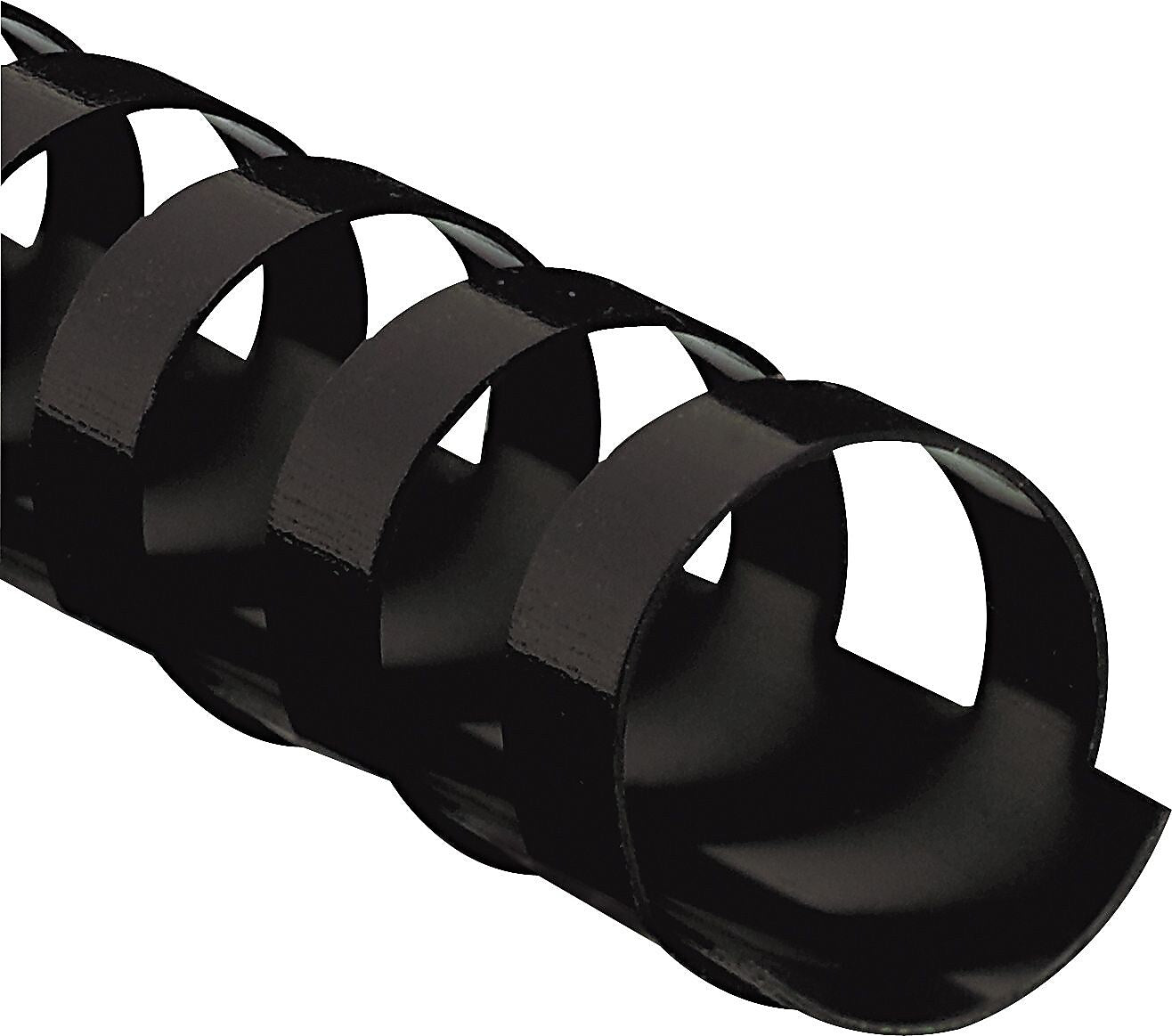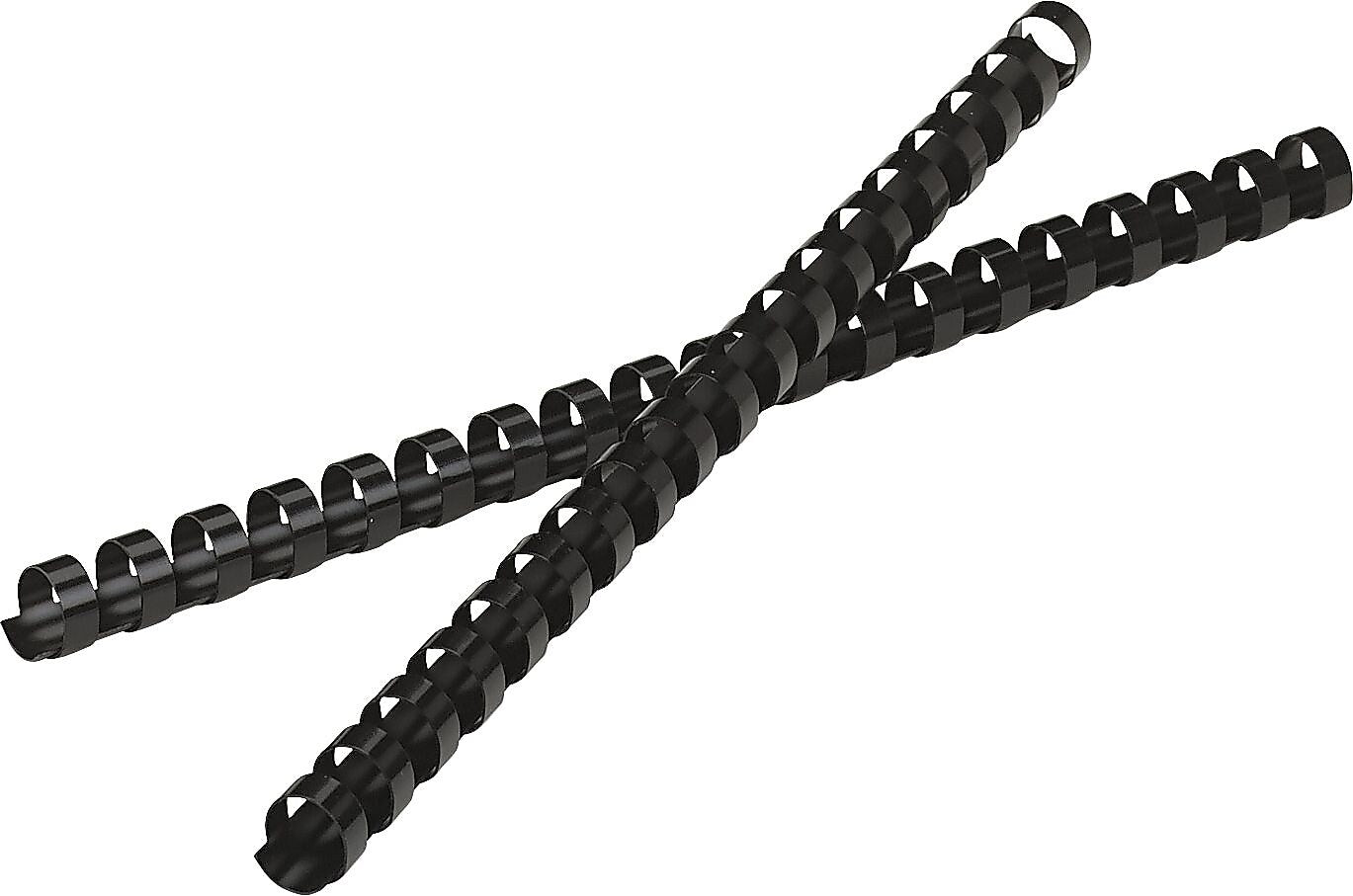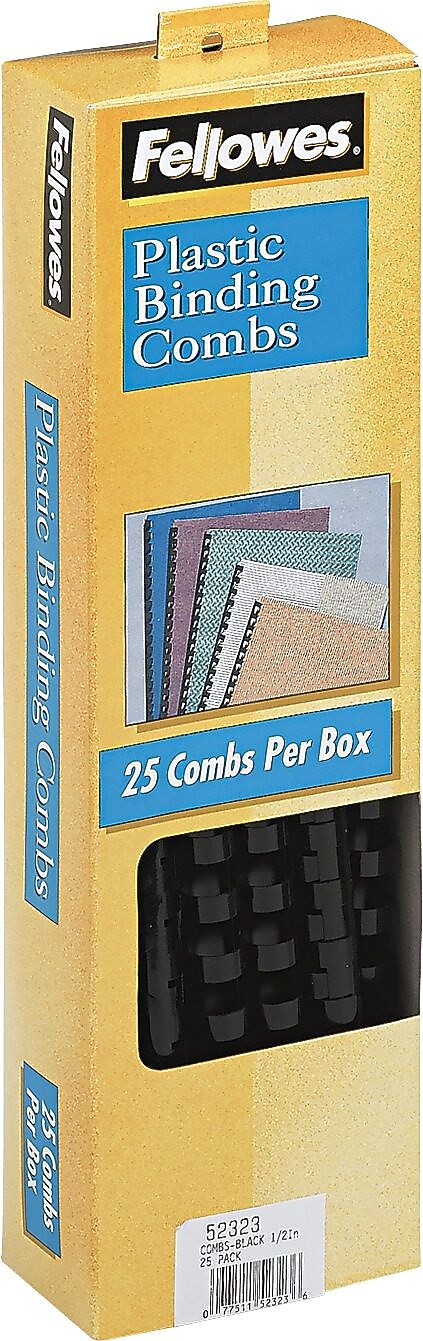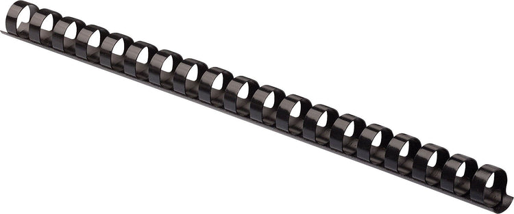 Fellowes® Plastic comb binding spines in black color have 1/2" diameter and provide a custom look to your reports as well as documents. Spines have a capacity to hold 90 sheets with its 19-ring comb binding system, sold as 25 per pack.
