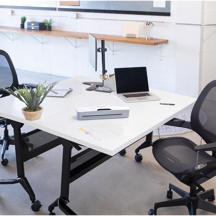 This user-friendly laminator for personal use in the home office offers rapid one-minute warm-up with InstaHeat Technology and versatile hot lamination or cold pouches of 3 mil or 5 mil thickness. Convenient release lever allows easy pouch re-centering or removal. Auto Shut Off saves energy and prevents overheating.