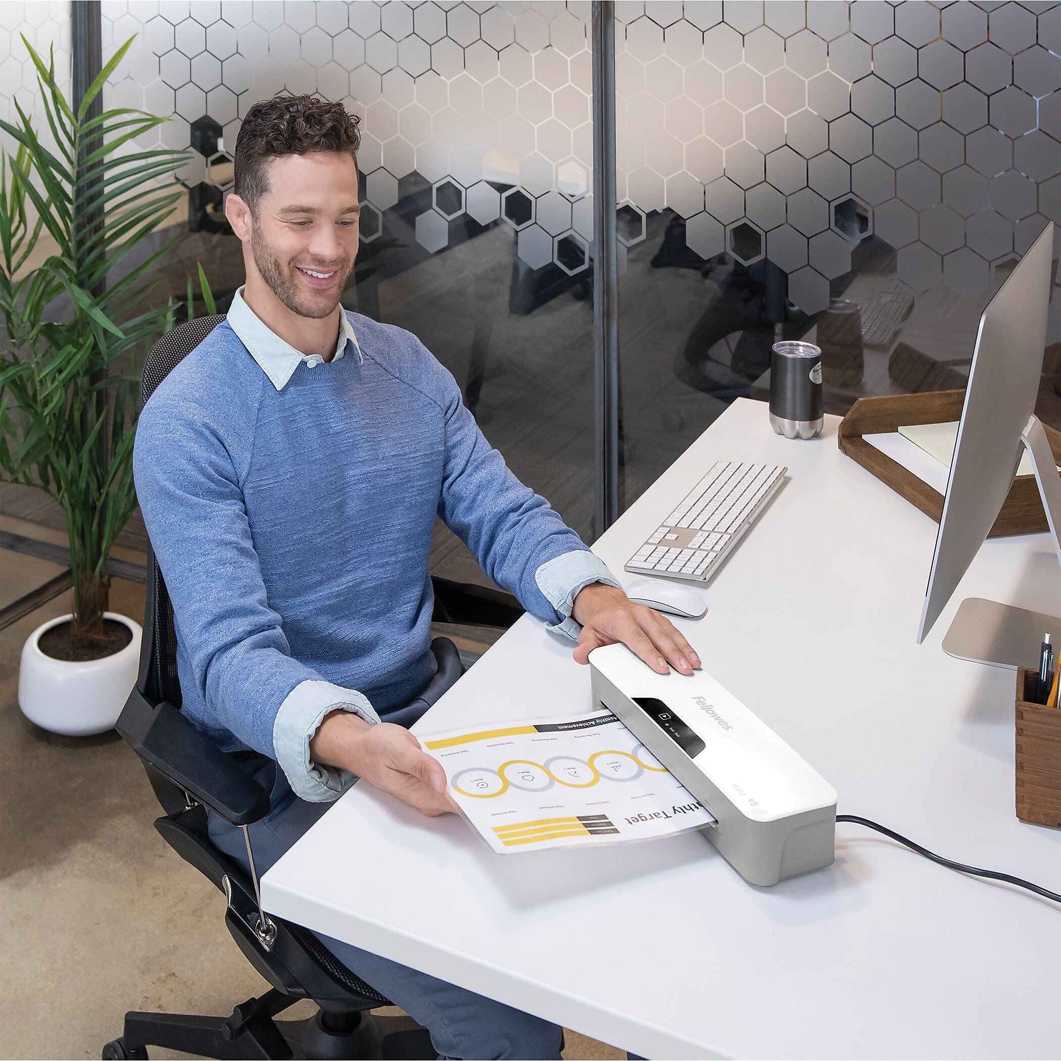 This user-friendly laminator for personal use in the home office offers rapid one-minute warm-up with InstaHeat Technology and versatile hot lamination of 3 mil or 5 mil pouches as well as cold pouch. Convenient release lever allows easy pouch re-centering or removal. Auto Shut Off saves energy and prevents overheating.