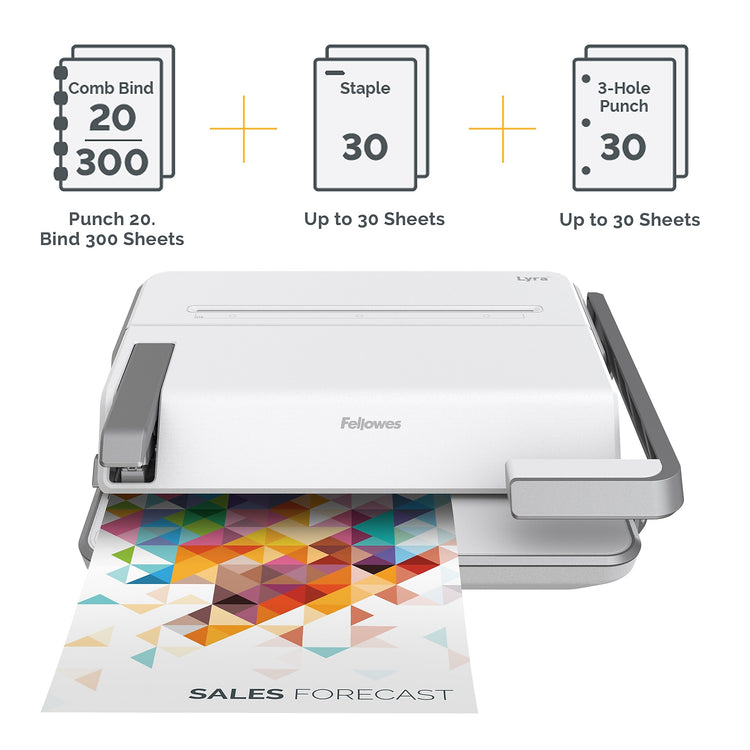 Fellowes Lyra Patented 3-in1 Comb Binding Machine, 30 Sheet Capacity, White/Gray (5603001)