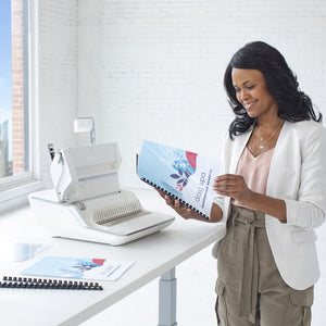 The unique Lyra™ 3-in-1 Binding Center combines stapling, 3-hole punching and comb binding in one machine. EasyPress double action staplers offers effortless stapling for up to 30 pages. Comb binds documents up to 300 pages, comb punches 20 sheets, 3-hole punches 30 sheets Vertical loading enhances accuracy for faster punching and binding. Precision alignment of punching and stapling delivers perfect results. Includes a document and comb measurement guide for ease of use. The Lyra is built for the office / classroom library and more.