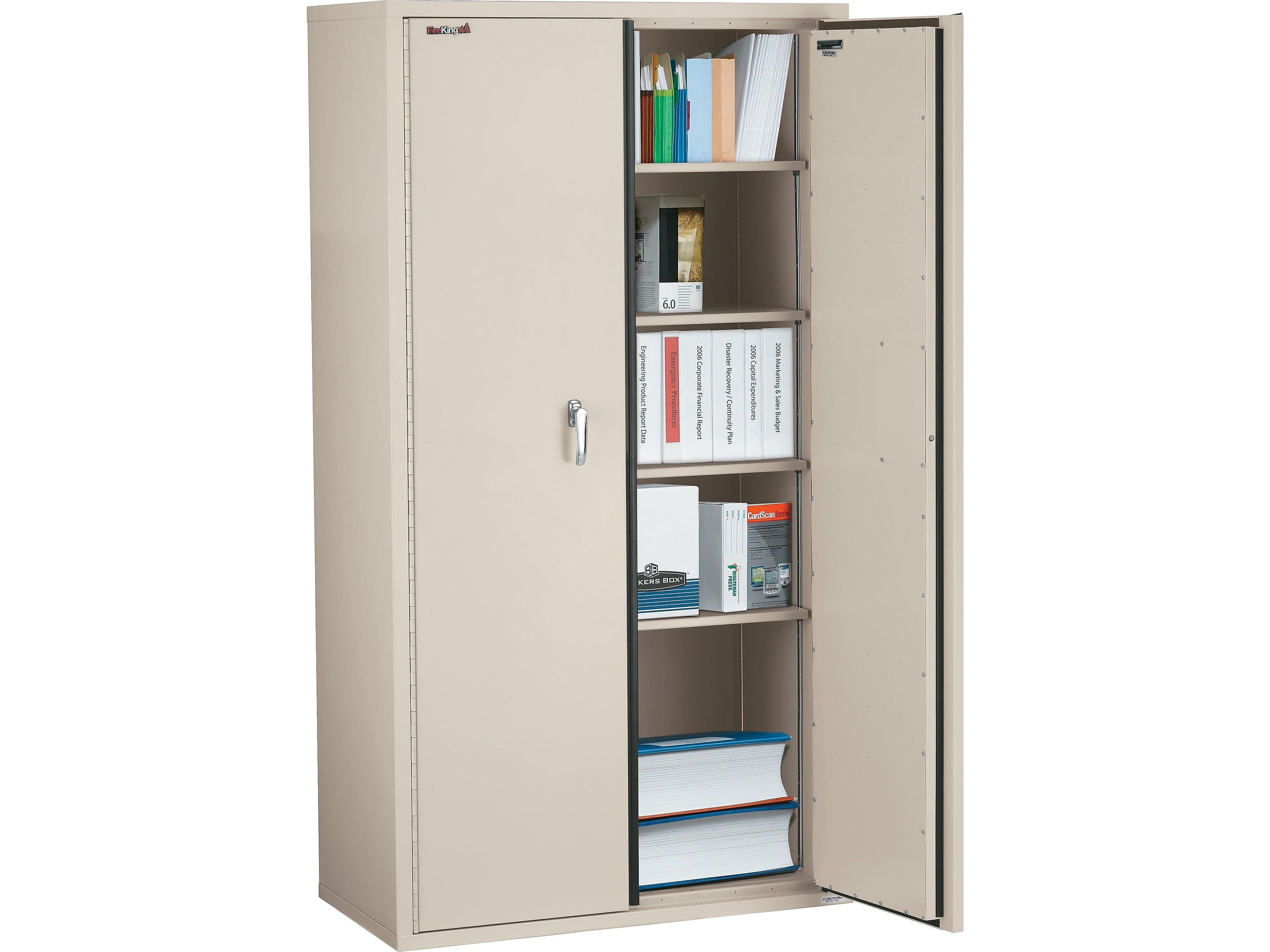 Safeguard important documents from fire and theft with this storage cabinet. The Medeco security lock resists picking and drilling, and the keys can only be duplicated through FireKing. Four shelves are adjustable, and each can hold up to 160 pounds. The powder-coated finish resists scratches and dents. This FireKing storage cabinet internal temperature stays below 350 degrees F for at least one hour in a fire.
