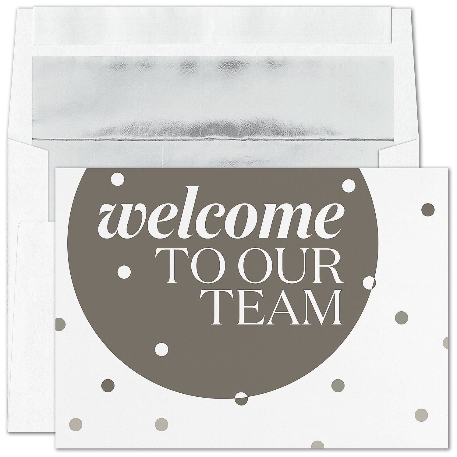 - Friendly Welcome card, set of 50 with silver foil-lined white envelopes. Each card measures 7 7/8" x 5 5/8" folded