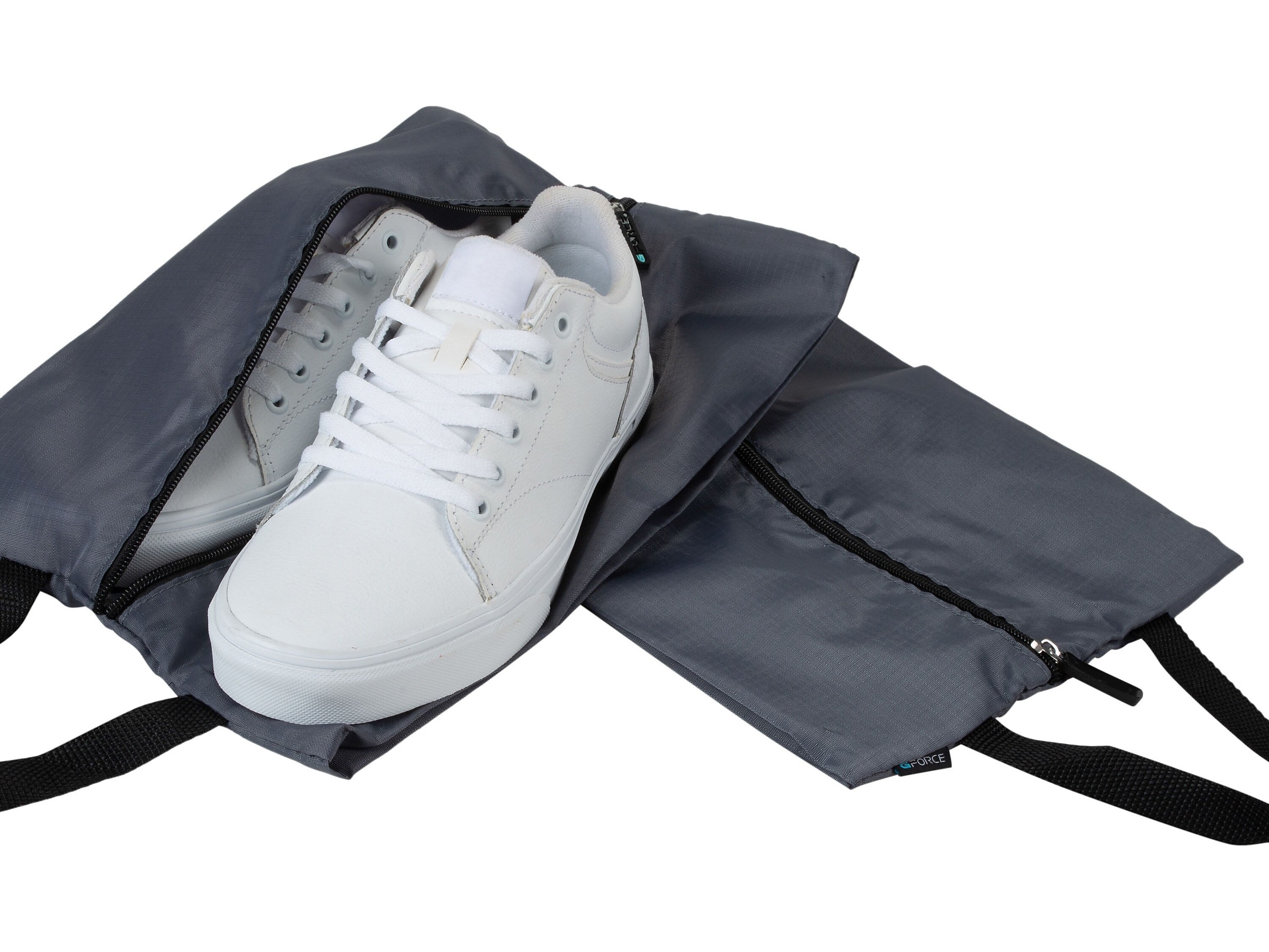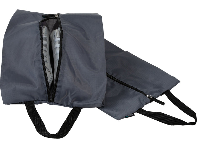Stay organized when you travel with the G Force traveling shoe bags. This set of two bags can easily fit one pair of dress shoes, sneakers, heels, or flats in each bag. Durable and lightweight, these shoe bags fit in almost every type of luggage. Protecting your shoes from dirt, scuffs, and scratches while protecting your other items within the luggage from the shoes. Made of ripstop nylon, these bags are sure to last many of your trips. Make your life and trip easier with this set of shoe bags.