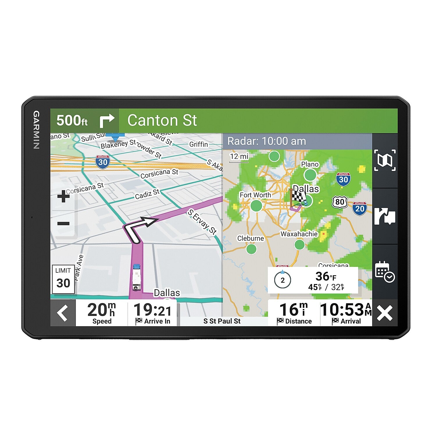 Plan to make memories with the Garmin RV 1095 GPS navigator. View the extra-large 10-in. display in landscape or portrait mode, with map updates of North America that include the U.S., Mexico, Canada, Puerto Rico, U.S. Virgin Islands, Cayman Islands, and Bahamas. Get custom routing for the size and weight of your rig—with road warnings for steep grades, sharp curves, and more (not available in all areas; always defer to posted road signs and road conditions). Access a directory of RV parks and services, and view suggestions for alternate scenic routes. Find the best spots along your route, learn of activities to try near your destination, and see Tripadvisor traveler ratings for top-rated restaurants and attractions. See an overview of your entire remaining trip alongside your active route, including expected weather up ahead when paired with the Garmin Drive app on your compatible smartphone. Also enjoy satellite imagery, which shows vivid aerial views to help you with a smooth arrival at your RV park or campground.