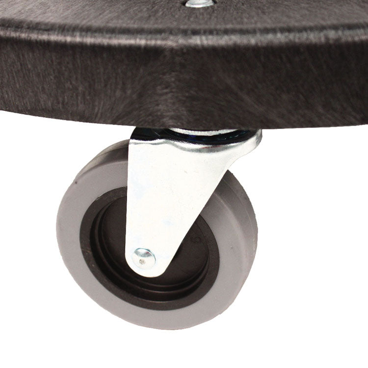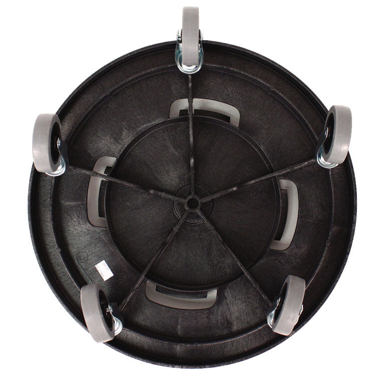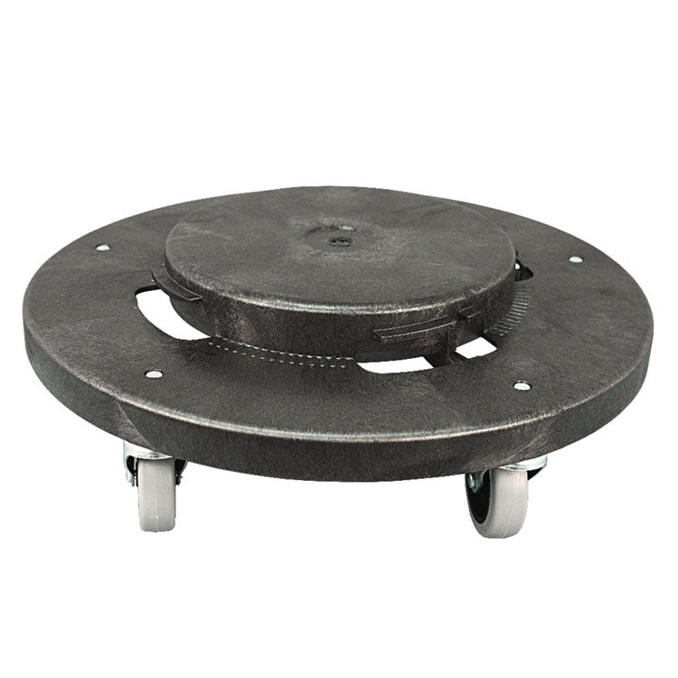 Wheeled dolly allows heavy waste containers to be transported with ease. Molded from structural foam for extreme durability. Quiet casters allow for cleaning during work and office hours. Fits to 20, 32, 44, and 55-gallon containers. Vented to prevent suction between dolly and container for easy twist off removal.