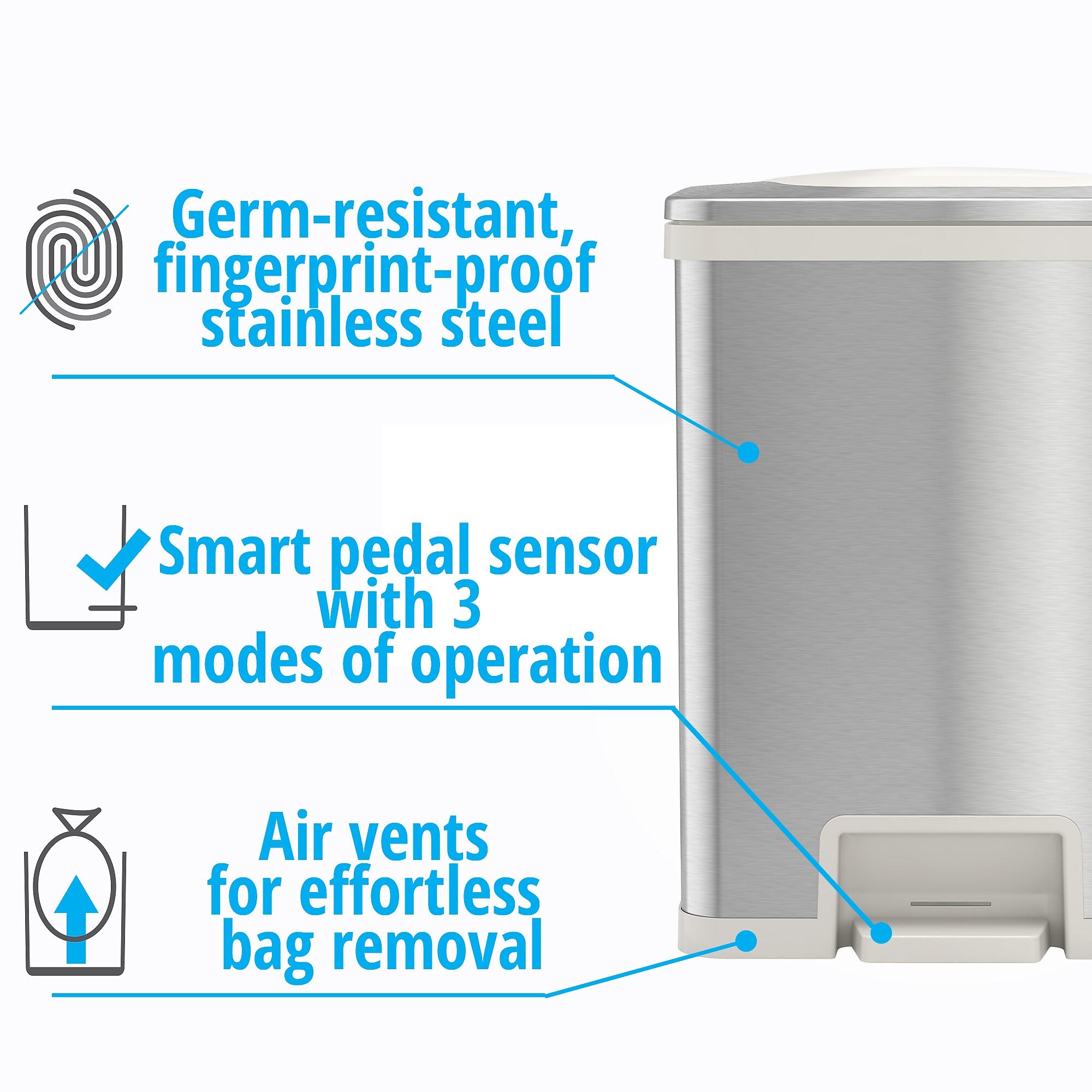 halo TapCan Stainless Steel Rectangular Pedal Sensor Trash Can with AbsorbX Odor Control System, White Trim, 13 Gal. (TC13SW)