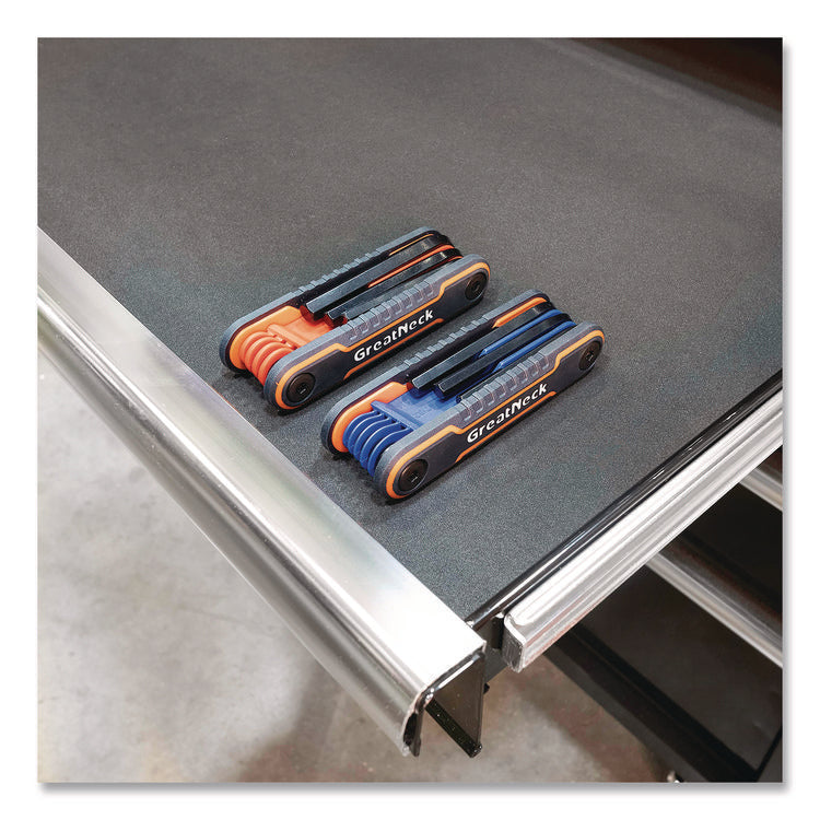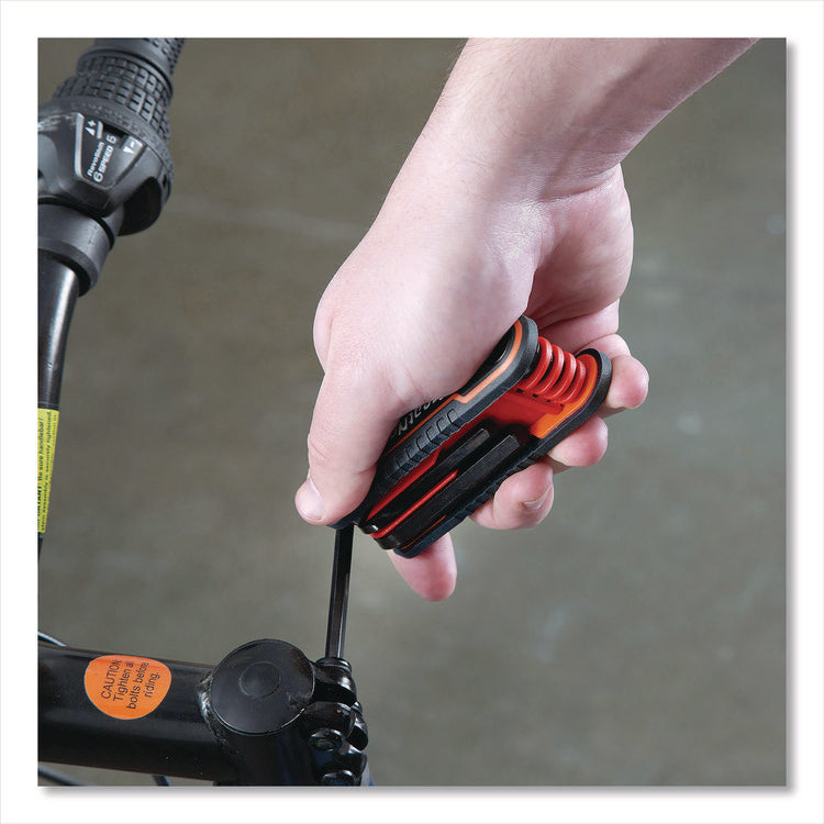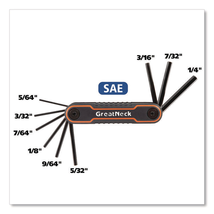The Great Neck® Hex Key Fold-Up Tool Set is the perfect addition to your toolbox! Key tines are precision ground for accuracy and polished with a rust- and corrosion-resistant black-oxide finish. The body of each fold-up tool is also clearly color-coded, so it can be easily identified and retrieved. Durable composite construction ensures a longer, productive life even when extended, rugged-environment use is the norm. Two hex-key adjustable tangs allow you to tailor the fold-out action of the tines to achieve a customized feel.