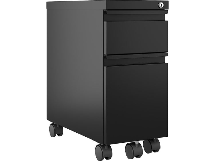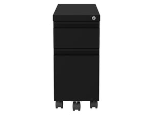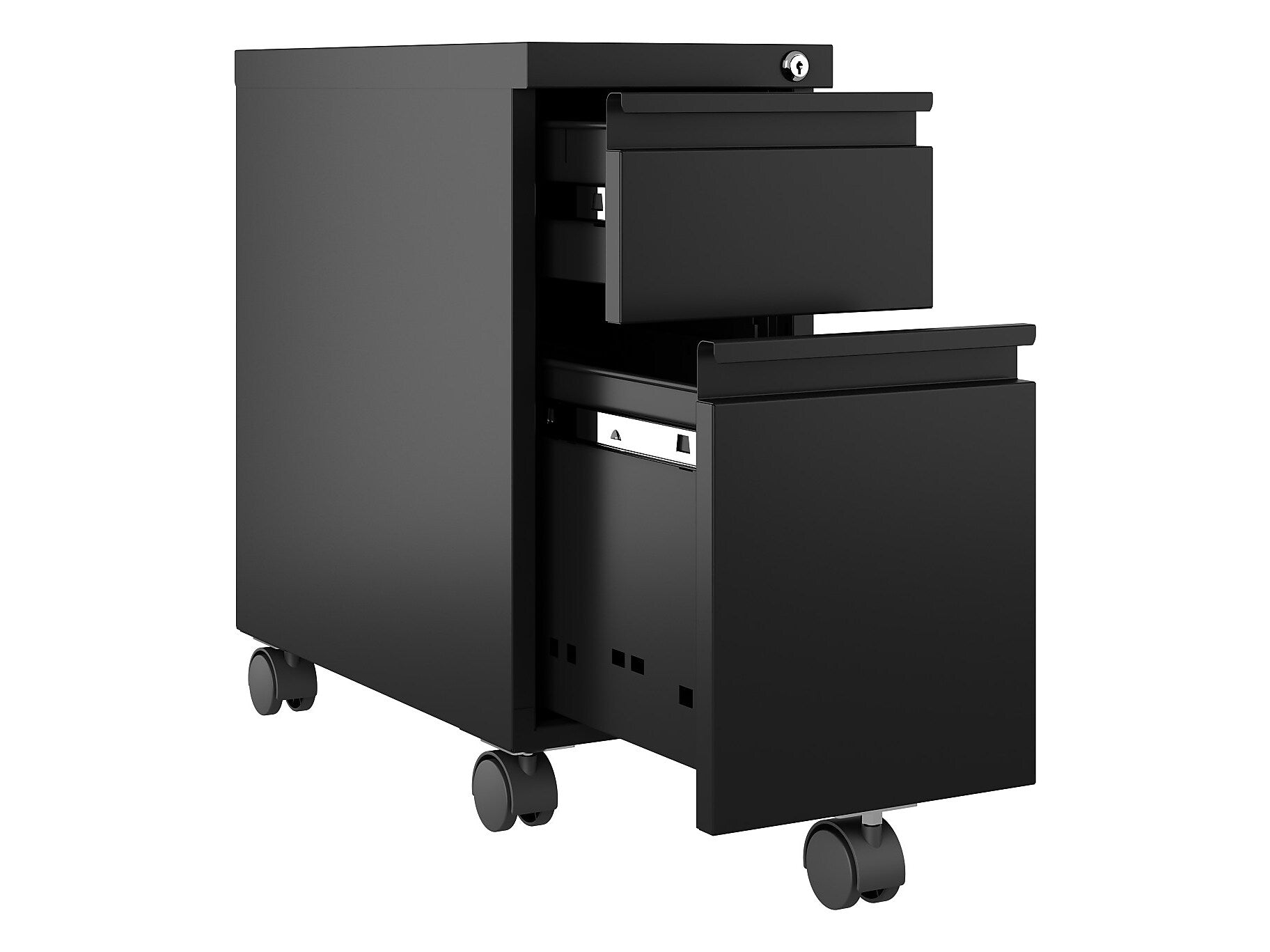 Compact alternative to standard pedestal files. The narrow design works great for smaller desks. Holds essential workstation supplies in the hidden box drawer. File drawer holds letter or legal size hanging file folders. Durable, fully assembled steel construction with non-porous surface is easy to clean. Lightweight design makes it easy to roll around. Includes a 5th swivel caster for stability eliminating the need for counterweights. Greenguard Gold certified for indoor air quality. Limited lifetime warranty.