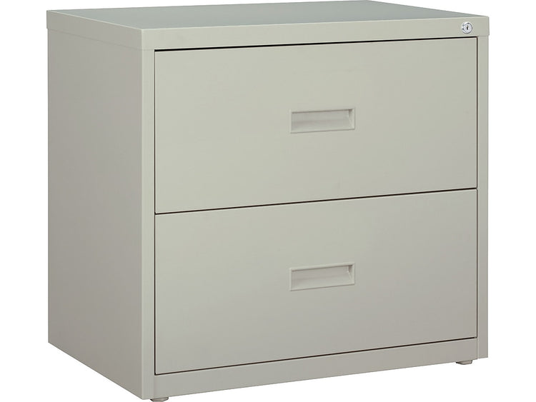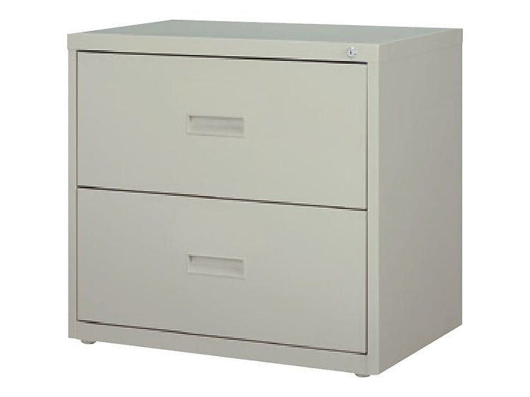 This 30 in. wide 2 drawer commercial grade lateral filing cabinet is designed for heavy duty use, yet looks great in any office. Precision ball-bearing suspension allows for quiet use in your busy office environment. Fully assembled steel construction for durability. Non-porous surface is easy to clean. Interlock system prevents tipping by only allowing one drawer open at a time. Core-removable lock comes standard. Unit includes hang rails and two adjustable leveling glides. Greenguard Gold certified for indoor air quality. Meets or exceeds ANSI-BIFMA standards. TAA compliant. Limited Lifetime Warranty.