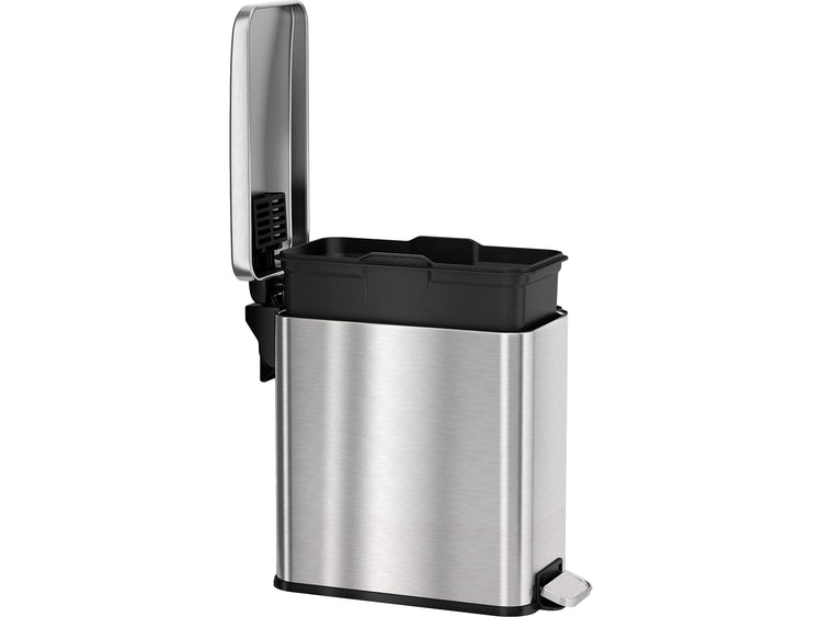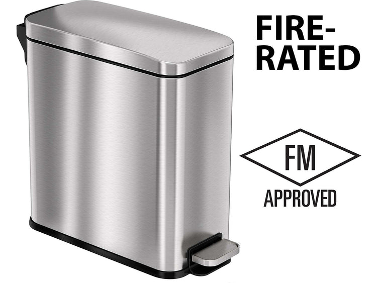 FM Approvals tested and certified, this HLS Commercial 3 gal. trash can provides the compliance, protection, and style you need and want in your facilities. Bin fires are quickly extinguished with the special fire-retardant liner material and a tight lid design that restricts airflow to the interior, starving the flame of necessary oxygen. Designed to be as aesthetically pleasing as it is safe and easy to use, the elegant stainless steel bin complements any decor. The smooth and easy pedal requires minimal effort and is coupled with a soft and silent lid close. Emptying the trash and recycling is quick and clean with the removable color-coded inner buckets.