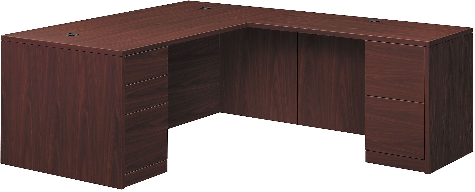 The 10500 Series is the workhorse of the workplace, giving everyone the workspace and tools they need to succeed. This L-shaped desk configuration includes a 72"W single pedestal desk on the left and a single pedestal return on the right to offer the worksurface area and storage space you need to stay productive and organized. The storage pedestals feature two box drawers and three file drawers to organize paperwork and office supplies. The distinctive hardwood laminate is scratch-, spill- and stain-resistant for long-lasting performance. The laminate color is Mahogany.