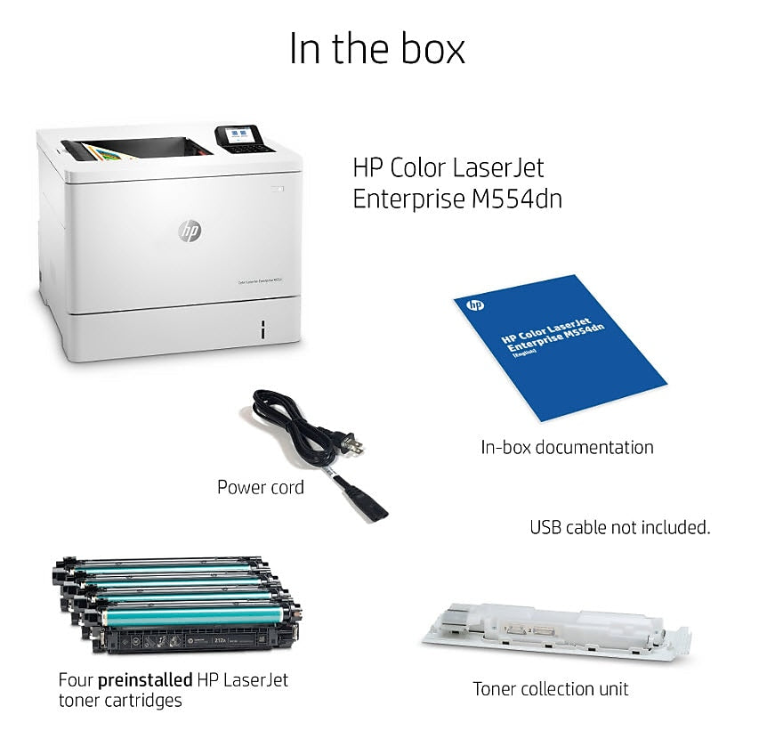 What's in the Printer Box | HP Color LaserJet Enterprise M554dn, Toner cartridge (black), Toner cartridge (cyan), Toner cartridge (magenta), Toner cartridge (yellow) |