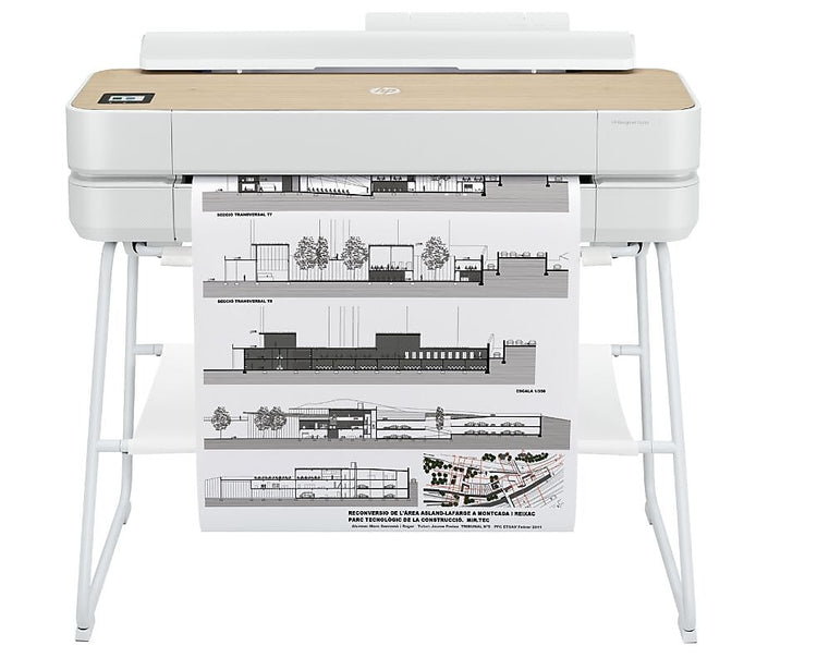 Featuring a modern office design that compliments its environment and performance to match. Print multi-size jobs easily with auto switching between roll and tray. Enjoy high-speed printing as fast as 25 sec per A1/D plot. 1 GB memory. AEC, GIS, and MCAD professionals who want to print maps, technical drawings, posters, and renders with precise, accurate line quality and crisp text. This is design that meets performance in the world’s easiest large-format plotters. Extreme simplicity helps you save time and print with confidence. Send multiple files in one click. Save time from job prep to final print. This printer is intended to work only with cartridges that have a new or reused HP chip, and it uses dynamic security measures to block cartridges using a non-HP chip. Periodic firmware updates will maintain the effectiveness of these measures and block cartridges that previously worked. A reused HP chip enables the use of reused, remanufactured, and refilled cartridges. Free, convenient HP ink cartridge and printhead recycling with HP Planet Partners; FSC®-certified papers and a range of recyclable HP media with a take-back program; First net carbon neutral HP DesignJet plotter; ENERGY STAR® certified.