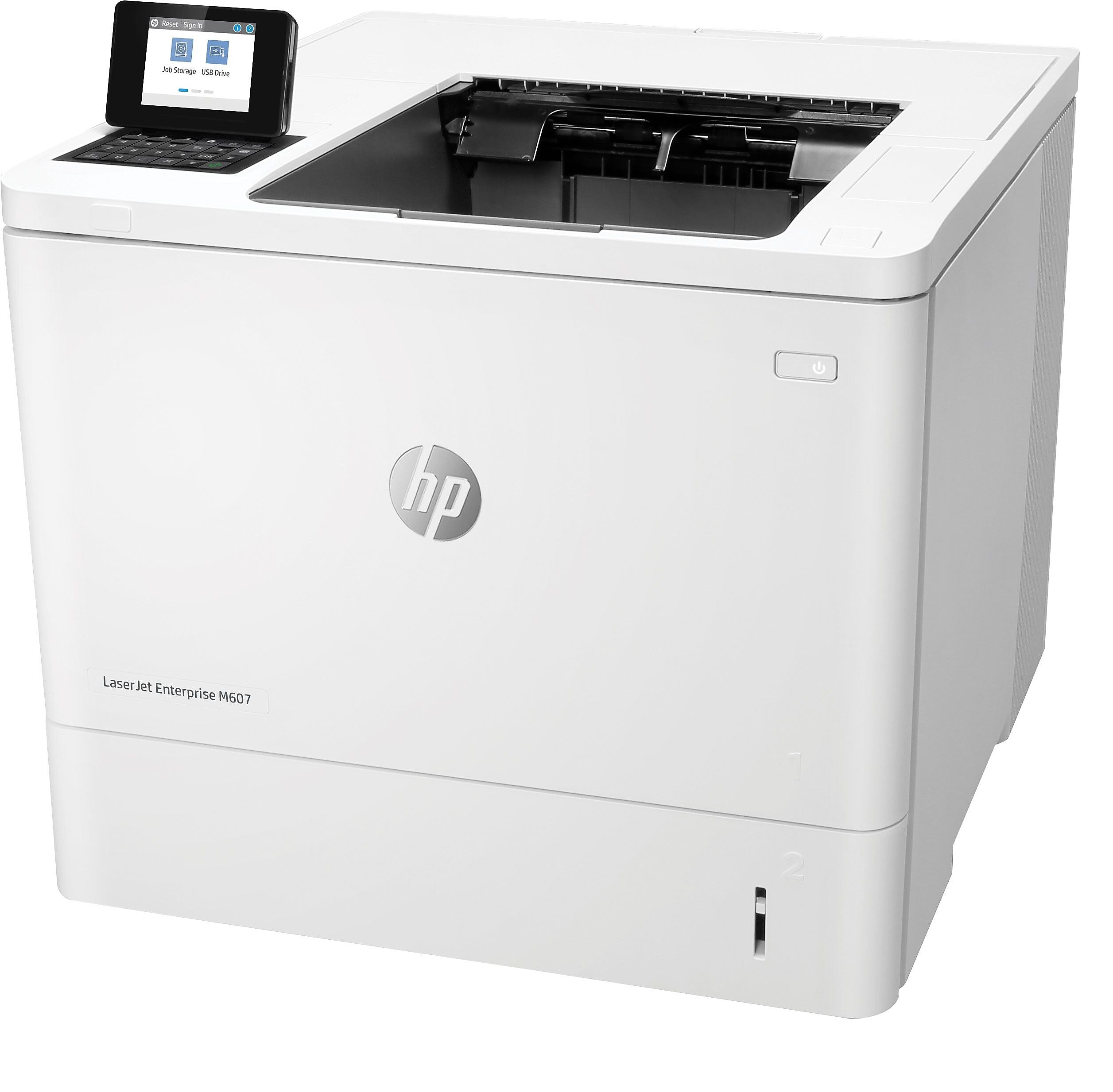 Get the world’s most secure printing with HP Sure Start, each printer regularly checks its operating code and repairs itself from attempted hacks. Rely on the HP LaserJet Enterprise M607n for run-time intrusion detection; the printer continually monitors to detect and stop attacks, then automatically reboots. Centralize control of your printing environment with HP Web —and help build business efficiency. Give workgroups what they need to succeed. Easily choose and deploy over 180 HP and third-party solutions. High-speed performance meets energy efficiency with the HP LaserJet Enterprise M607n business printer and speed through tasks and save paper. This printer wakes up fast and prints your first page faster—in as quickly as 7.8 seconds. This printer uses exceptionally low amounts of energy thanks to its innovative design and toner technology. Paper handling options include a 550-sheet input feeder for paper sizes A6 to legal. More pages, performance, and protection from the HP LaserJet Enterprise M607n.