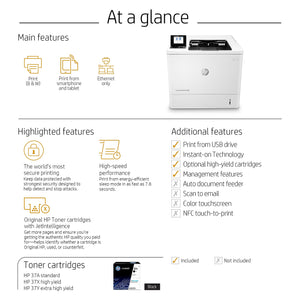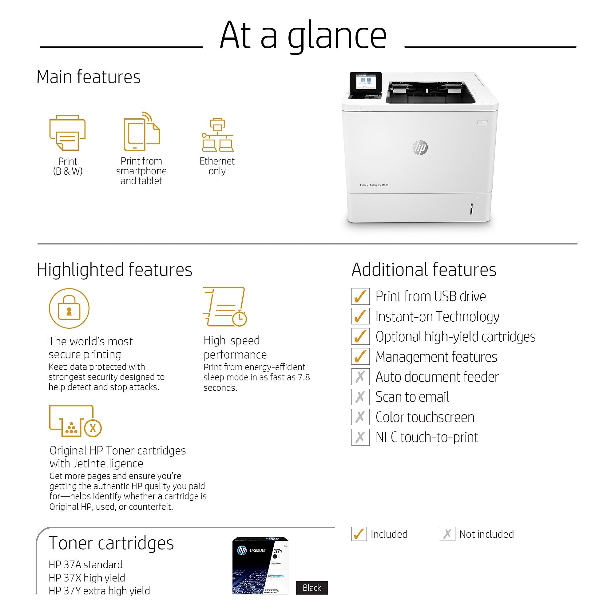 Give your entire work group access to high-quality document creation capabilities with this network printer. Speeds of up to 65 pages per minute ensure fast, efficient operation, while the 2.7-inch LCD color rotating display and push-button keypad make it easy to select the correct function for every task. Reduce your office's daily paper consumption with the manual duplex printing option, or use single-page printing to create contracts and forms. This printer comes equipped with a 550-sheet input feeder for everyday printing jobs and a 100-sheet multipurpose feeder to create custom envelopes, postcards, and other specialty documents. Use the mobile print option to send jobs from a smartphone or tablet, and access saved files on external drives with the Hi-Speed USB 2.0 host. With built-in Gigabit Ethernet, this HP LaserJet Enterprise printer provides your office with a dependable network connection.