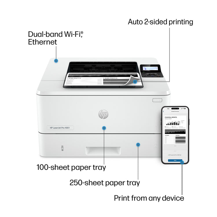 Get ultra-fast speeds and powerful productivity with the LaserJet Pro 4001dw. Get laser quality black & white printing for all your business documents. Set up and manage printers in multiple locations with a single dashboard.