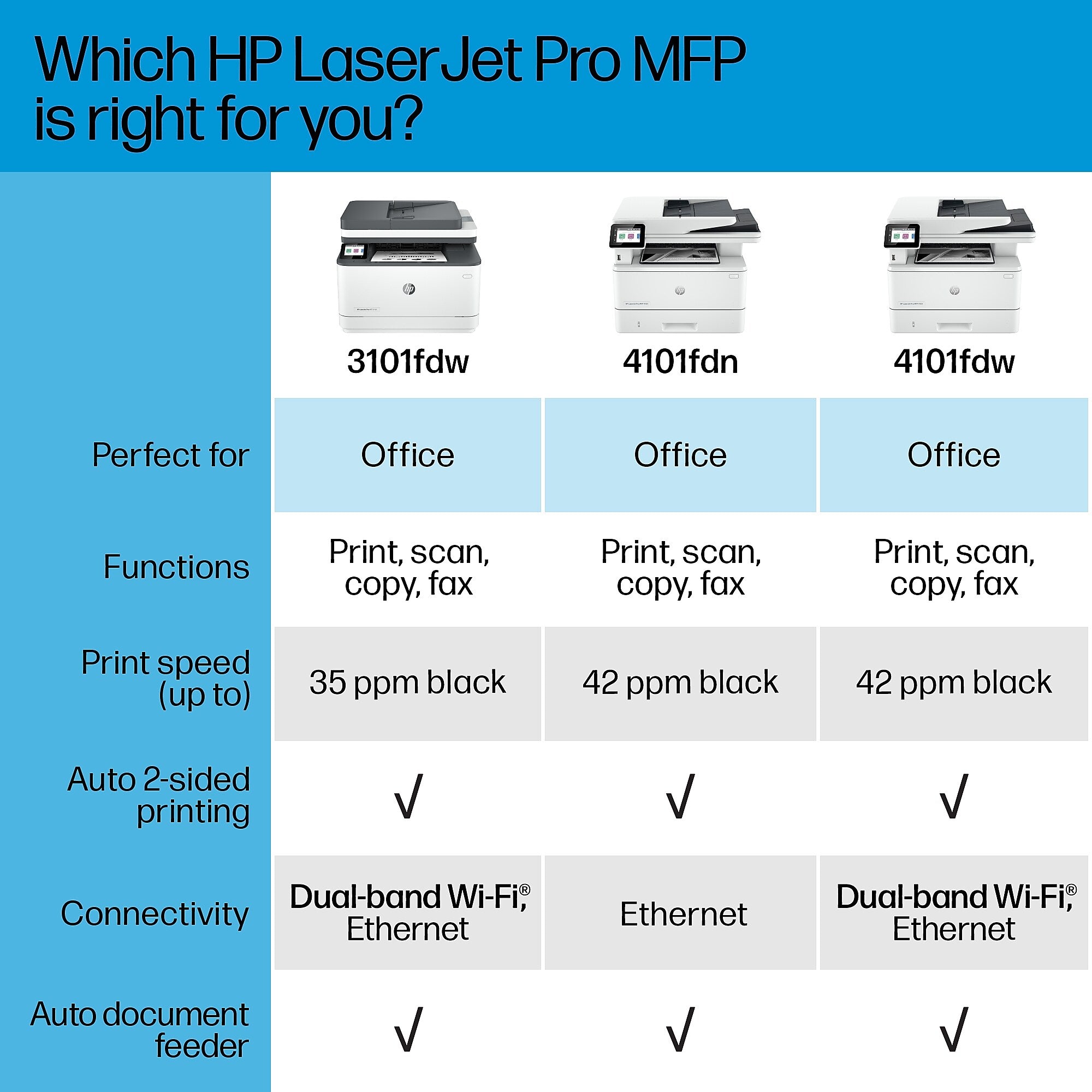 The LaserJet Pro MFP 4101fdn all-in-one printer delivers laser quality black & white printing, scanning, copying and fax for all your business needs. Get blazing fast speeds, auto 2-sided printing, an automatic document feeder, and powerful productivity with advanced features for small teams. Share among users on your office network with wired ethernet connectivity.