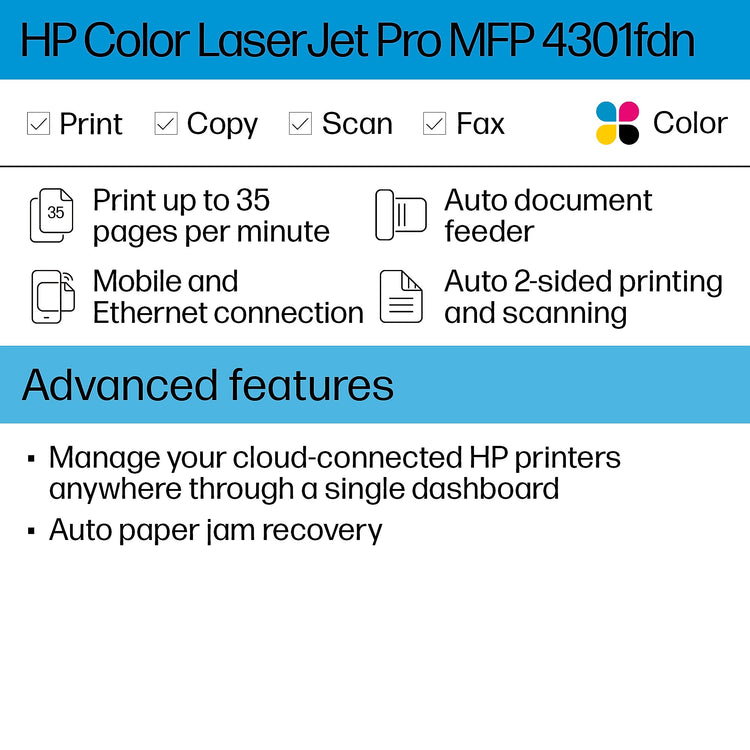 Get vibrant laser-quality color and powerful productivity with the Color LaserJet Pro MFP 4301fdn. Super fast and super easy with advanced features for small teams.