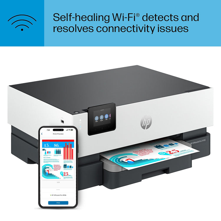 The HP OfficeJet Pro 9110b delivers fast color printing, 250-sheet paper capacity, and duplex printing. It includes wireless and printer security capabilities to keep your inkjet printer up to date and secure.