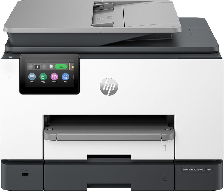 The HP OfficeJet Pro 9135e delivers fast color printing, 500-sheet paper capacity, and 2-sided scanning and copying. It includes wireless and printer security capabilities to keep your multifunction printer up to date and secure.