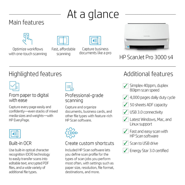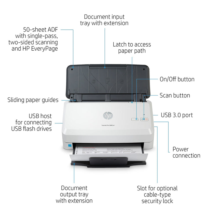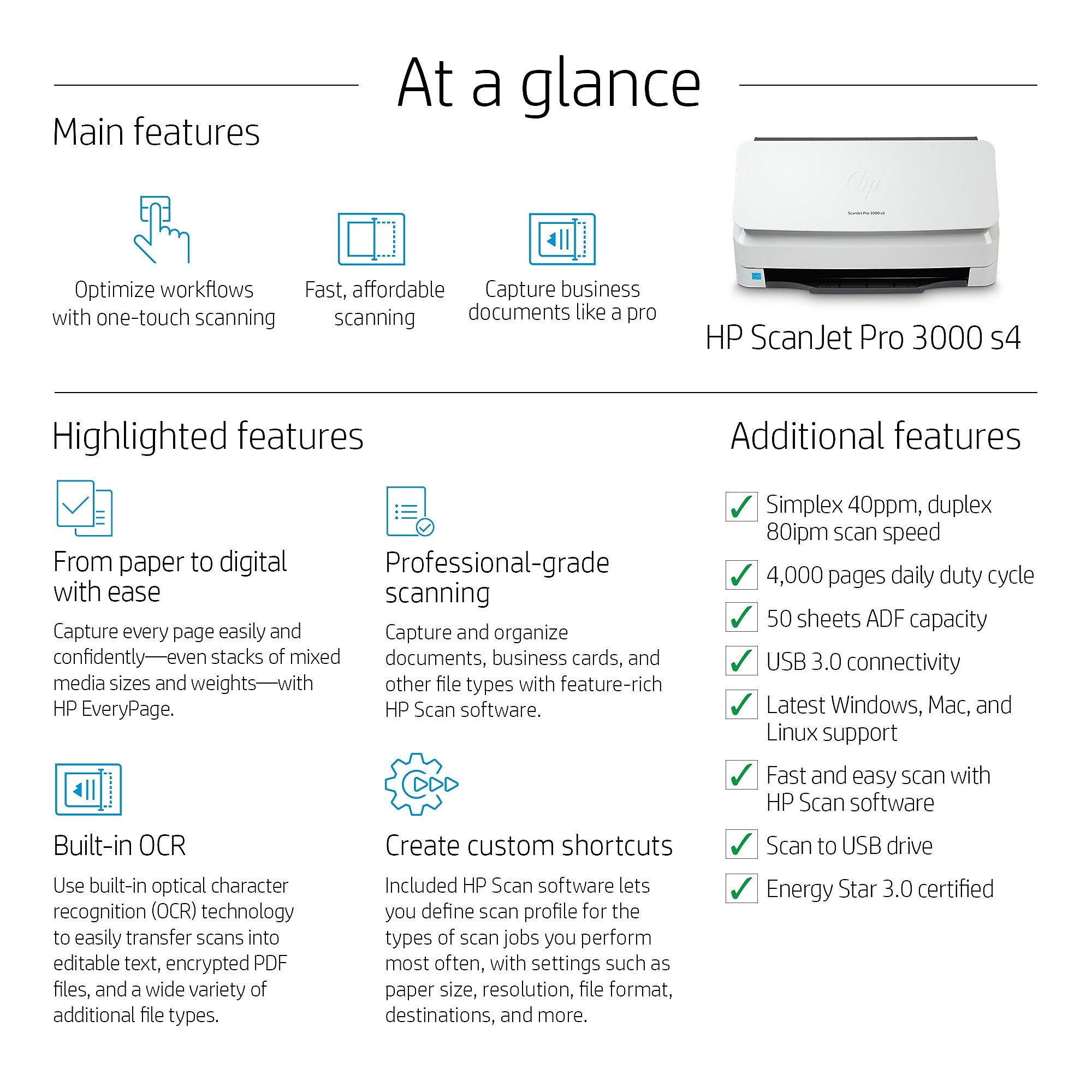 This HP Scanjet Pro desktop scanner is fast, affordable, and designed to handle everything from simple color jobs to complex workflows. Quickly and reliably digitize larger projects with scan speeds up to 40 ppm/80 ipm and a 50-page ADF. Recommended for 4000 pages per day.