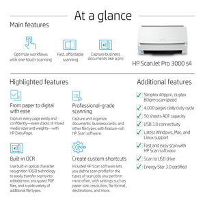 HP Scanjet Pro 3000 s4 Duplex Desktop Document Scanner, White (6FW07A#BGJ)