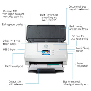 This HP Scanjet Pro desktop scanner is fast, affordable, and designed to handle everything from simple color jobs to complex workflows. Quickly and reliably digitize larger projects with scan speeds up to 40 ppm/80 ipm and a 50-page ADF. Recommended for 4000 pages per day.