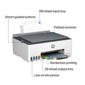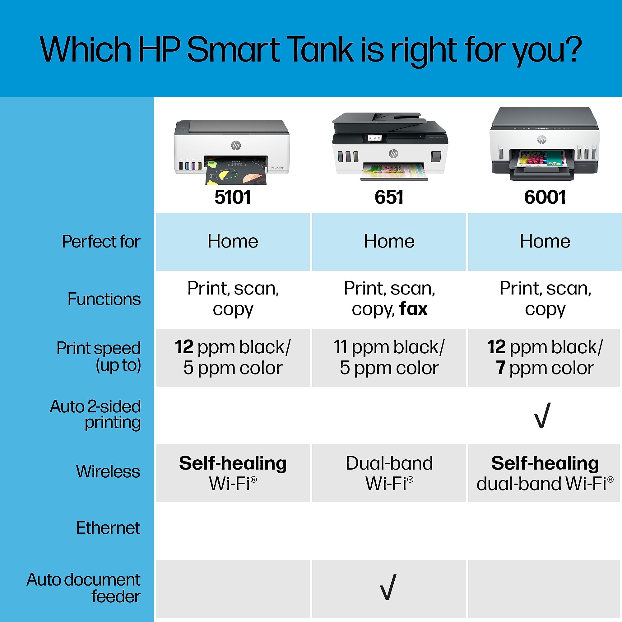 The HP Smart Tank 5101 Printer is a smart, connected and refillable tank printer that makes printing seamless for your home with its high capacity and wireless connectivity. Create everyday color documents at a low cost with 2 years of Original HP Ink included in the box. This Smart Tank printer is an inkjet perfect for high-volume printing.