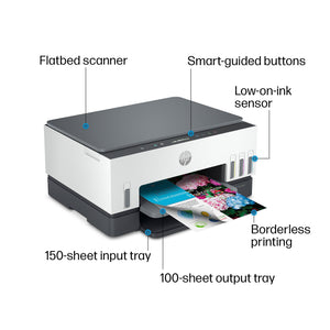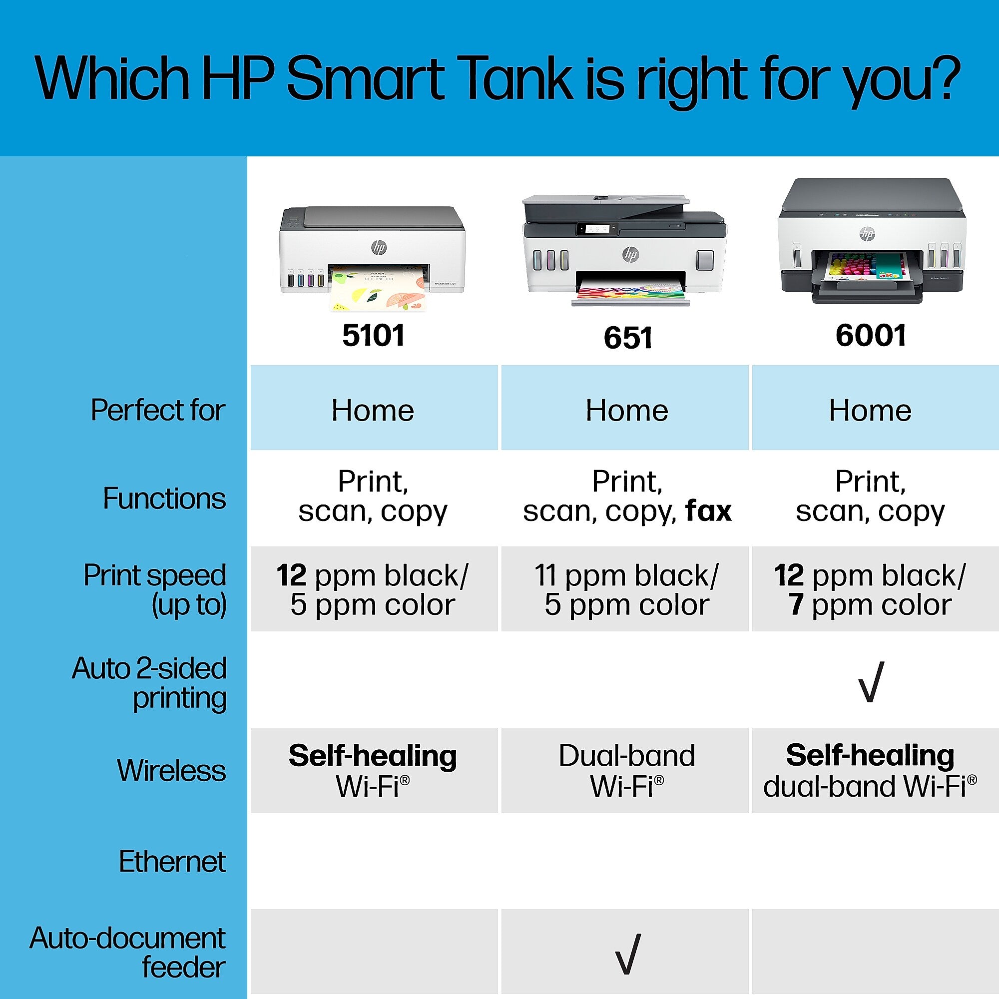 The HP Smart Tank 6001 Printer is a smart, connected and refillable tank printer that makes printing seamless for your home with its high capacity and wireless connectivity. Create everyday color documents at a low cost with 2 years of Original HP Ink included in the box. This Smart Tank printer is an inkjet perfect for high-volume printing.