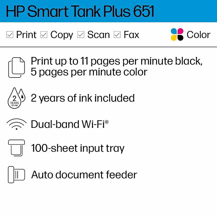 From America's most trusted printer brand, the HP Smart Tank Plus 651 is a refillable tank printer that makes printing seamless for your home with its high capacity and wireless connectivity. Create everyday color documents at a low cost with up to 2 years of Original HP Ink included in the box.
