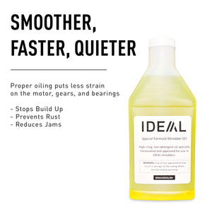 ideal. shredder oil is a specially blended, non-toxic, high-cling, non-detergent oil formulated exclusively for ideal. shredders. It is recommended that shredder blades be oiled for every 30 minutes of operation for cross-cut shredders, and for every hour of operation for strip-cut models. Oil helps your shredder run smoother, faster, and quieter, and puts less strain on the motor, gears, and bearings.