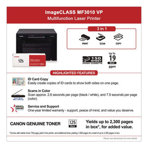 The imageCLASS MF3010 is designed for home and small office environments where black-and-white multifunction capability is needed, and productivity and ease of use are priorities. Print up to 19 pages-per-minute with a first print out of time of approximately eight seconds (letter). Features a paper capacity of up to 150 sheets and is backed by Canon's Service and Support network. ID Card Copy easily creates copies of your identification cards and other small documents. Includes an additional 125 toner cartridge.