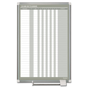In & Out board features rows for employees or visitors and is perfect for displaying staff schedules. The Magnetic Gold Ultra™ dry erase lacquered steel surface is recommended for frequent use. The Sliding aluminum pen tray keeps pens and magnetic accessories where you want them. Aluminum frame features the four-corner system for easy mounting.