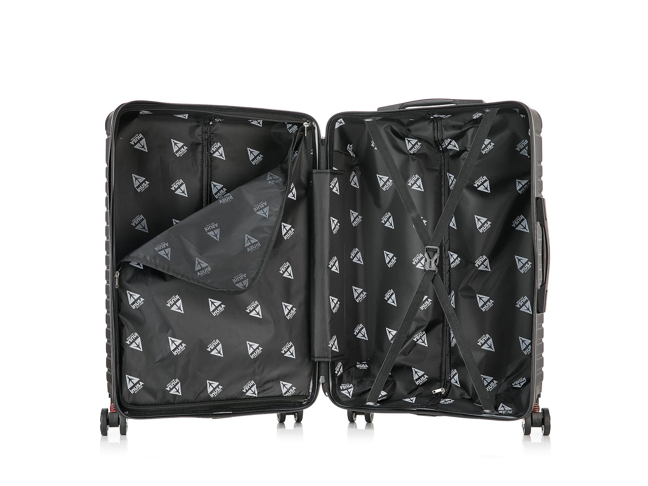 - Full interior fabric lining with zipper compartment on one side and snap-on straps on the opposite side for easy packing