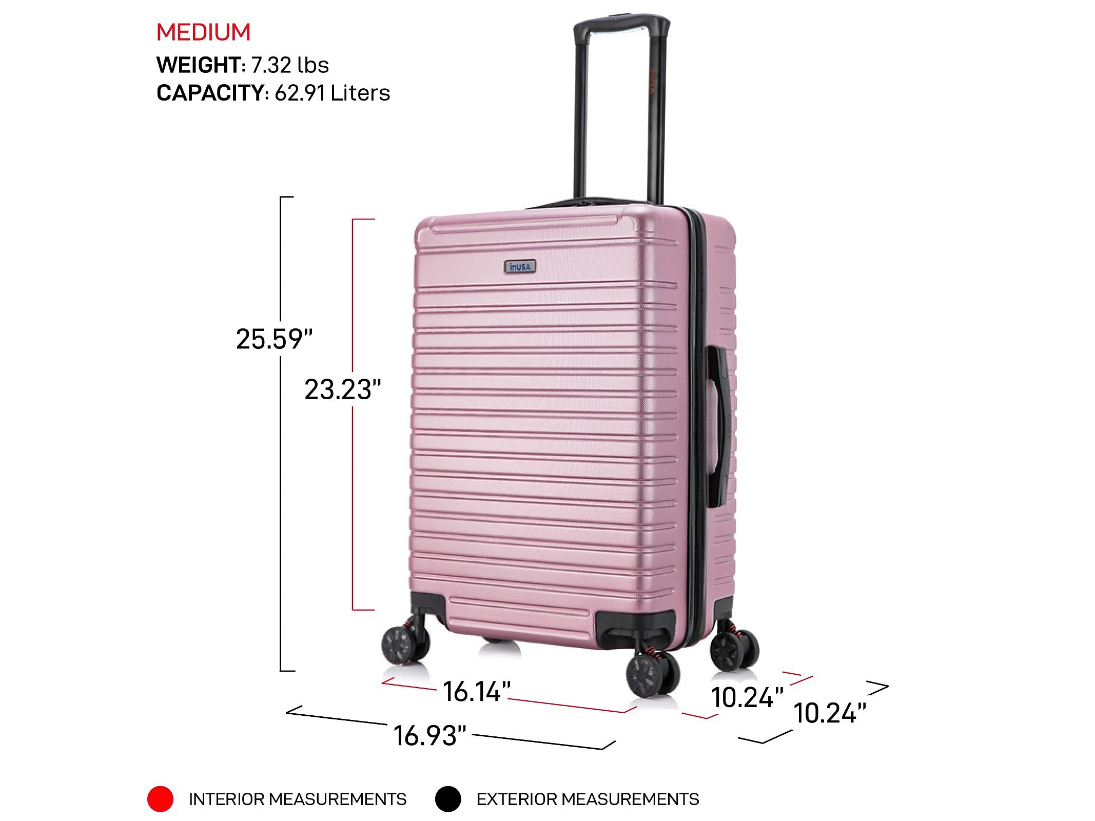 - Medium-sized spinner luggage has a 62.91L capacity
