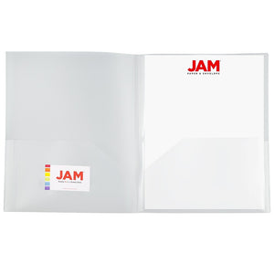 JAM Paper Clear 6 Pocket Heavy Duty Plastic Multi Pocket Folders are made out of smooth, heavy duty plastic. These folders measure 9 x 12 inches each. This pack contains 2 folders. Each of these folders has two pockets located on either side of the inside cover. Four additional pockets are included on either side of two translucent plastic sheet pages on the inside of each folder. This means that each of these folders contains a total of 6 pockets to help you store and organize large volumes of papers. Use these multi pocket folders for intensive classes or for those work documents that need to stay orderly and in one place.