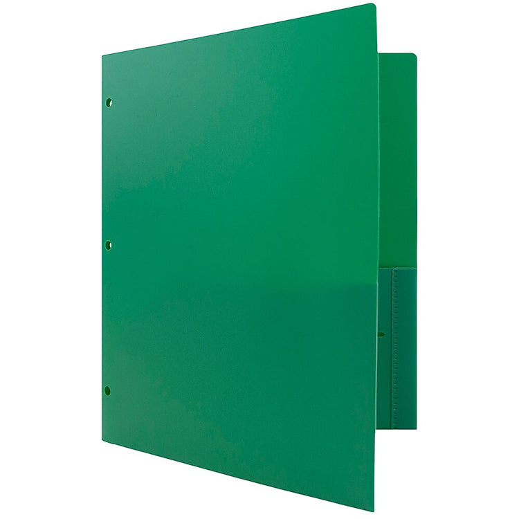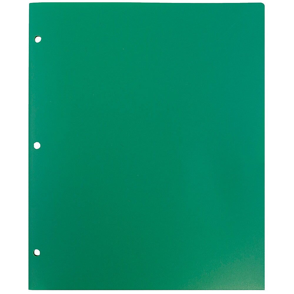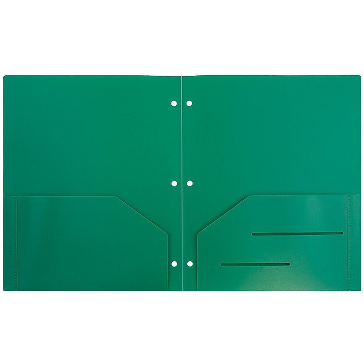 JAM Paper® Green Plastic Two Pocket 3 Hole Punched Presentation School Folders are 9.5 x 11.5 inches in size and feature three punched holes along the edge on the left side designed to fasten them into 3-ring binders. On the inside, each of these folders features two pockets, one on each side. The right side pocket features 2 slits for business cards, brochures, or other small documents. These folders are sold in packs of 6 and are made out of durable, heavy duty plastic. The green color of these folders is sure to being a feel of the outdoors into your office, class room, or work space and to add some personality to any office supply collection. This pack comes complete with 6 folders.