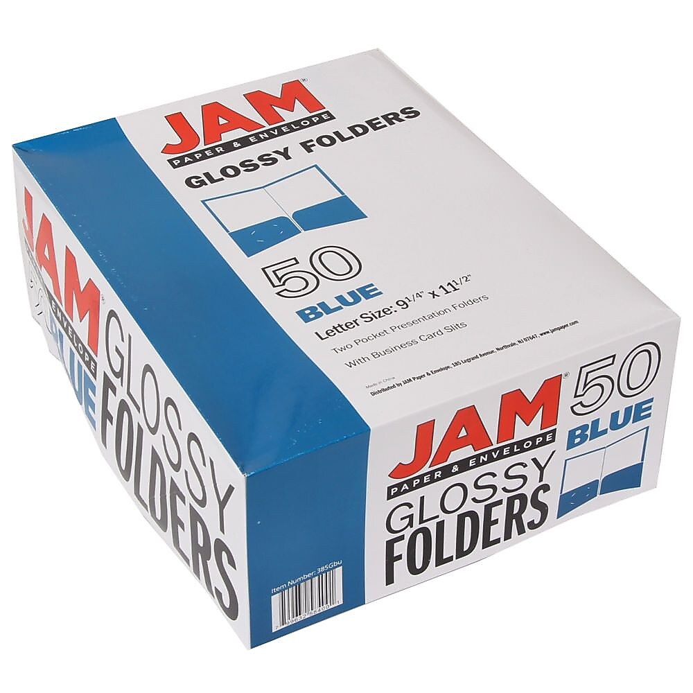 JAM Paper Laminated 2-Pocket Glossy Presentation Folders, Blue, 25/Pack (385GBUD)