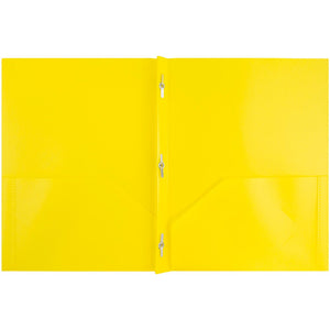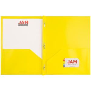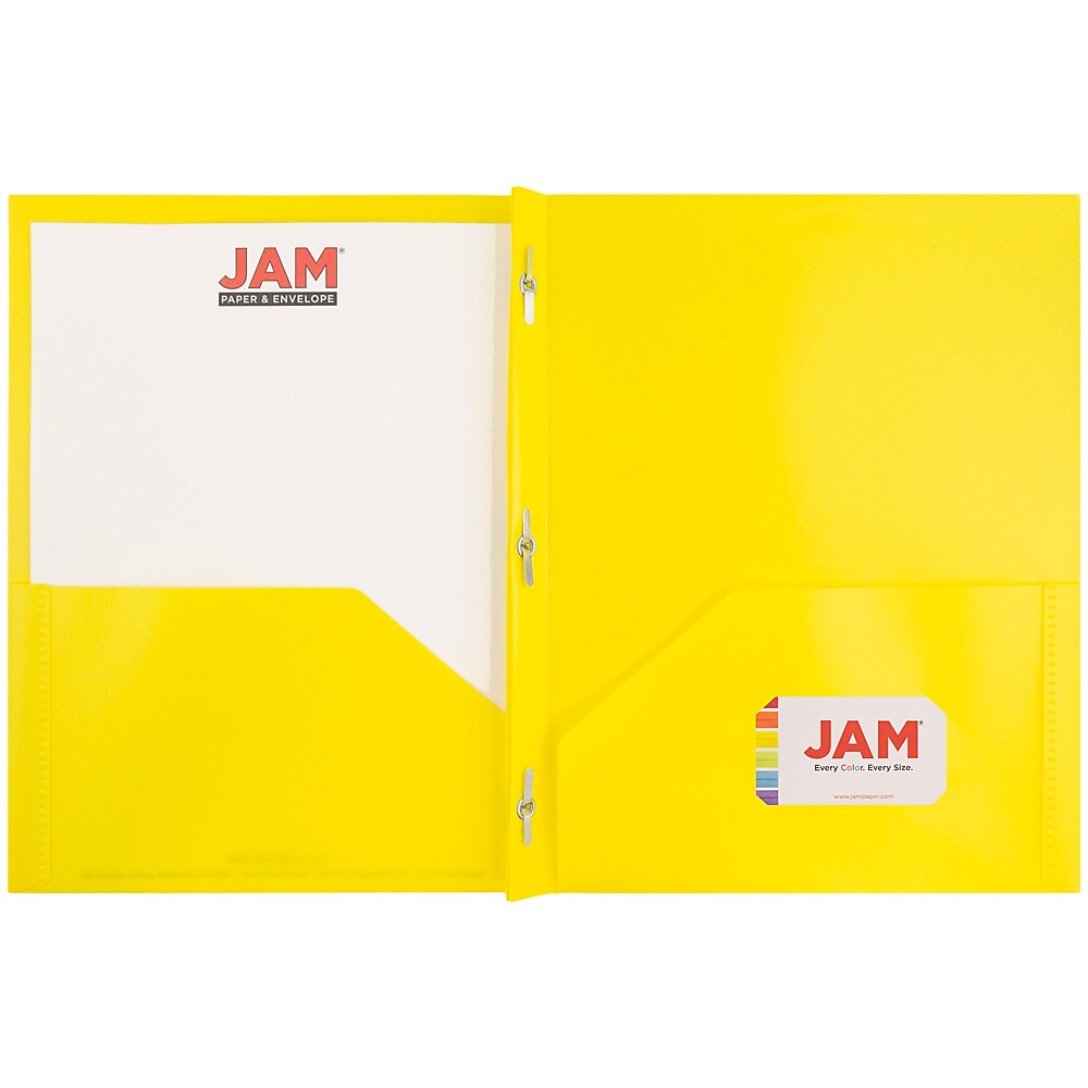 Organize reports, handouts, and other papers easily in these durable yellow folders. Each folder in this 6-pack includes three prong clip fasteners along the spine to secure hole-punched sheets and two interior pockets to hold loose papers for quick access. These yellow JAM Paper plastic folders also include business card pockets, making them great for presentations and interviews.