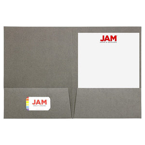 JAM Paper Gray Linen Two Pocket Presentation Folders are made out of heavy duty 100lb card stock and measure a convenient 9 x 12 inches in size, which makes them ideal for standard sized sheets of paper. These folders are sold in packs of 25. Each one features two pockets on the inside along with a business card slot on the left side pocket. These folders are an elegant and sophisticated smoky gray color and have a refined linen finish. This combination gives them a classy and professional appearance that looks fantastic in any professional or academic setting. Use these folders to store and organize your documents and to carry them from place to place.