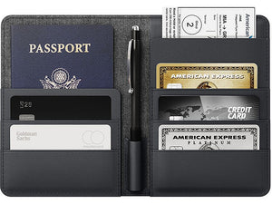 - Features five card slots, a passport pocket, a boarding pass pocket, a pen holder, and a hidden money pouch