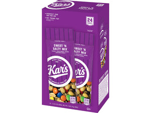 Keep vending machines and snack bars stocked with this single-serve mix. Each of these 2 ounce bags contains a combination of roasted and salted nuts, naturally sweet raisins, chocolate candies and sunflower seeds for a chewy and crunchy texture. With no cholesterol, trans fat or gluten, this Kar's SWEET'N SALTY snack mix is a healthy snack and a great source of protein and natural energy.