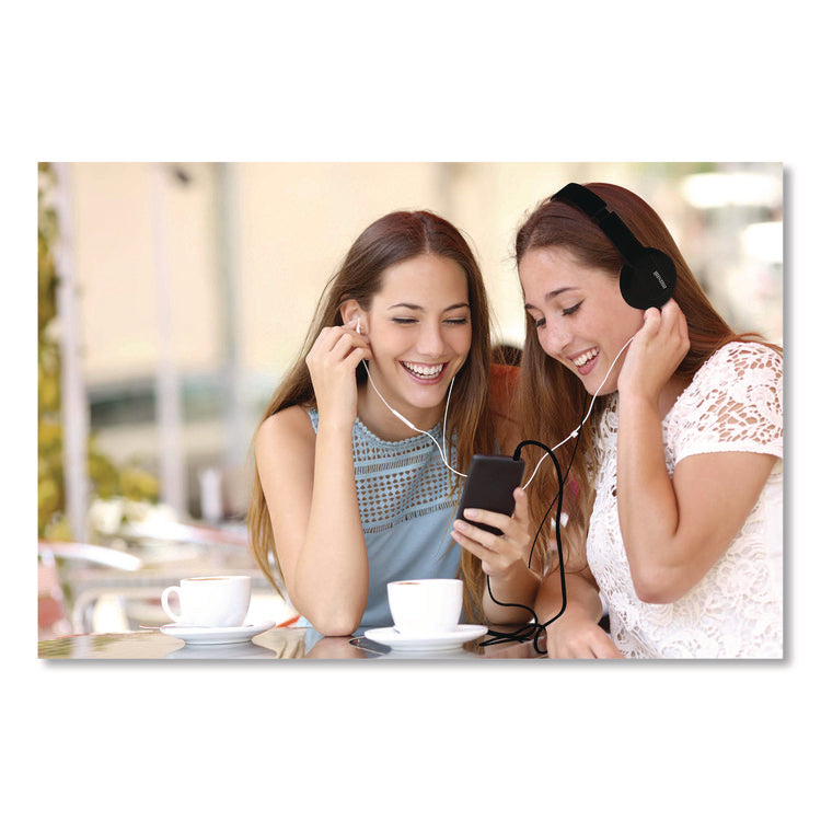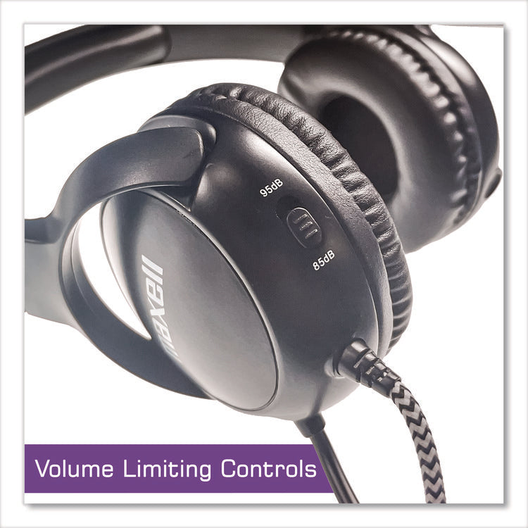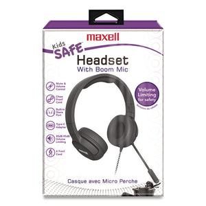 Maxell Kids Safe volume limiting wired headphone with boom style microphone features a 95 dB maximum safe listening level. The attached, flexible boom microphone provides improved communication, especially in louder environments. Full cup earpiece blocks background noise. Features a flexible headphone and chew-proof, extended length 6 ft cord. The Maxell Kids Safe Headphone comes with attached 3.5 mm plug and also includes a USB-C adapter for added connectivity flexibility. This headphone is feature-heavy with mute and volume control, as well as a built-in share port which allows two headphones to connect together and listen from the same audio source. Package also includes a resealable and easy-label plastic storage bag.