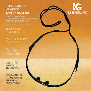 KleenGuard Personal Protective Equipment (PPE) enables rather than inhibits allowing for maximum productivity and safety for you and your employees. Giving your employees what they need to do their job safely and effectively is a top priority of any business owner. KleenGuard Nemesis Safety Eyewear's stylish good looks and durable, lightweight construction are just some of the reasons why millions of people wear them for protection both at work and at home. Nemesis Safety Glasses have KleenVision Anti-Fog coated polycarbonate lenses that provide 99.9% UVA/UVB/UVC protection to help prevent eye damage like cataracts, retinal damage, and other conditions that can cause temporary vision loss. The wraparound frame has a base curve of eight that extends the range of peripheral protection, as well as soft-touch temples for comfort. The Nemesis safety glasses have a patented nose piece designed to be extremely flexible, to channel sweat away from the eyes, and to help prevent slippage down the nose, all for long-term comfort. Each pair of KleenGuard Nemesis safety glasses come with a neck cord for securing them, so that the glasses are ready to protect at a moment's notice. Both men and women will find these stylish glasses to be comfortable and functional for construction, manufacturing, shooting range and a host of other industries. Remember: comfort and style drive compliance, so it pays to provide comfortable designer glasses that your staff will be proud to wear. Making the right Personal Protection choice is difficult. Perform with distinction with KleenGuard Personal Protective Equipment (PPE).