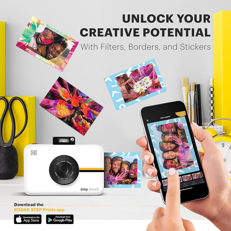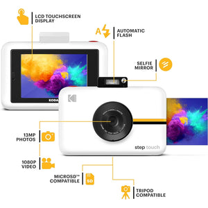 Whether you're an avid traveler, social influencer, nostalgic partygoer, or on-the-go photographer, one thing is certain—printing pictures takes too many steps. Now, with the New KODAK Step Touch Instant Print Camera (Black), printing full-color photographs is as simple as point, shoot, and print. This 3-in-1 device features a powerful 13MP mini digital camera, 1080p HD camcorder, and a built-in printer with ZINK Zero Ink Paper technology. Use the handy touchscreen in the "Insta camera" to take, view, and edit photos, then press 'print' to receive stunning 2"x3" sticky-back prints in an instant. Photos printed in this Kodak instant camera come out clear, bright, colorful, and covered with an extra layer of protective coating to prevent smudges, rips, and water damage. Bluetooth is also built right into the portable camera, so you can connect to your favorite smartphone or tablet to print memories from long ago. Use our extensive editing tools in the mini instant camera to apply flattering filters, funny emojis, decorative frames, and other personalized flairs. Take the next STEP with the Kodak Step Touch Instant Picture Camera.